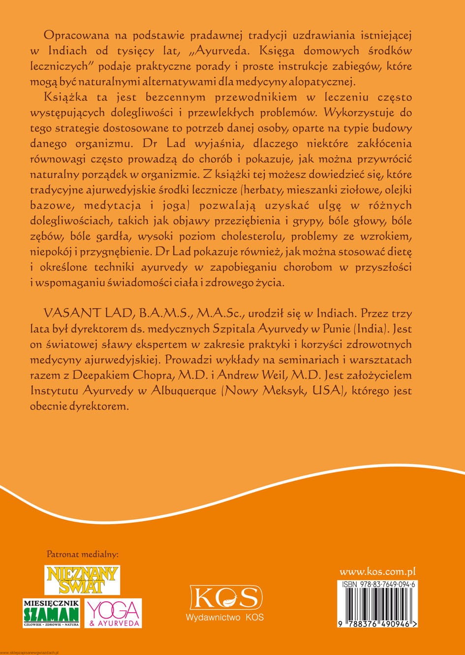 Książka umożliwia także wykorzystanie pożytecznych metod uzdrawiania tradycji ayurvedy, które są doskonalone od tysięcy lat. Wszystkie zioła, potrawy i olejki zalecane przez dr Lada można znaleźć w sklepach ze zdrową żywnością albo zakupić wysyłkowo. Uzupełniona obszernym glosariuszem, wykazem sprzedawców produktów i podstawowej literatury, książka ta jest podstawowym przewodnikiem po naturalnych, bezpiecznych i skutecznych domowych środkach leczniczych, które możemy na co dzień stosować dla zapewnienia sobie żywotności i dobrego samopoczucia.