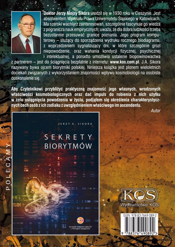 Doktor Jerzy Alojzy Sikora urodził się w 1930 roku w Cieszynie. Jest absolwentem Wydziału Prawa Uniwersytetu Śląskiego w Katowicach. Ma szeroki wachlarz zainteresowań, szczególnie fascynuje go wiedza z pogranicza nauk empirycznych; uważa, że dla dobra ludzkości trzeba bezustannie przesuwać granice poznania. Jego program komputerowy – służący do sporządzenia wydruku rocznego biodiagramu, z wyprzedzeniem sygnalizujący dni, w które szczególnie grozi niepowodzenie, oraz wahania kondycji fizycznej, psychicznej i intelektualnej, a ponadto umożliwia ustalenie biopowinowactwa z partnerem – jest do ściągnięcia bezpłatnie z internetu: www.kos.com.pl. J.A. Sikora nazywany bywa ojcem biorytmiki polskiej. Niniejsza książka jest plonem wieloletnich dociekań związanych z wykorzystaniem znajomości wpływu kosmobiologii na osobiste doskonalenie się.