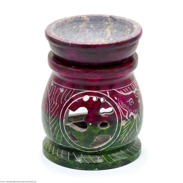 Elegancki kominek zapachowy ze steatytu to doskonałe połączenie estetyki i funkcjonalności. Kominek wyróżnia się starannym rzeźbieniem, przedstawiającym symbol Om oraz wizerunek słonia, co nadaje mu orientalny charakter i sprawia, że idealnie wpisuje się w asortyment produktów związanych z medytacją, aromaterapią i relaksacją. Wielokolorowe wykończenie, z dominującymi odcieniami fioletu i zieleni, sprawia, że każdy egzemplarz jest niepowtarzalny.