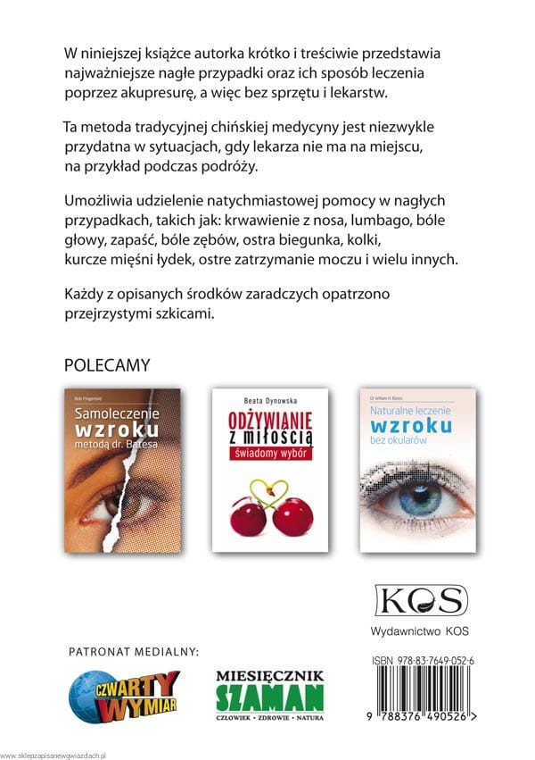 W niniejszej książce autorka krótko i treściwie przedstawia najważniejsze nagłe przypadki oraz ich sposób leczenia poprzez akupresurę, a więc bez sprzętu i lekarstw. Ta metoda tradycyjnej chińskiej medycyny jest niezwykle przydatna w sytuacjach, gdy lekarza nie ma na miejscu, na przykład podczas podróży. Umożliwia udzielenie natychmiastowej pomocy w nagłych przypadkach, takich jak: krwawienie z nosa, lumbago, bóle głowy, zapaść, bóle zębów, ostra biegunka, kolki, kurcze mięśni łydek, ostre zatrzymanie moczu i wielu innych.
