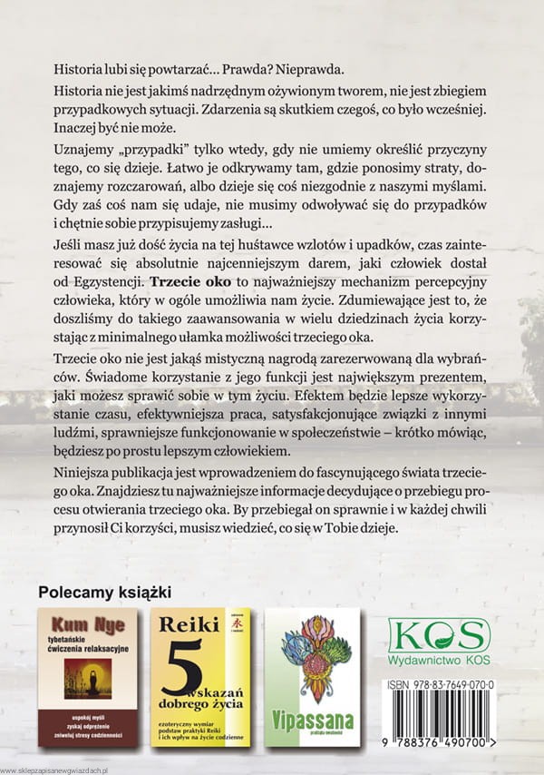 Trzecie oko nie jest jakąś mistyczną nagrodą zarezerwowaną dla wybrańców. Świadome korzystanie z jego funkcji jest największym prezentem, jaki możesz sprawić sobie w tym życiu. Efektem będzie lepsze wykorzystanie czasu, efektywniejsza praca, satysfakcjonujące związki z innymi ludźmi, sprawniejsze funkcjonowanie w społeczeństwie – krótko mówiąc, będziesz po prostu lepszym człowiekiem.