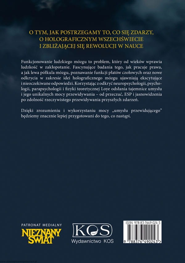 Funkcjonowanie ludzkiego mózgu to problem, który od wieków wprawia nas w zakłopotanie. Fascynujące badania tego, jak pracuje prawa, a jak lewa półkula mózgu, poznawanie funkcji płatów czołowych oraz nowe odkrycia w zakresie idei holograficznego mózgu ujawniają ekscytujące i nieoczekiwane odpowiedzi. Korzystając z odkryć neuropsychologii, psychologii, parapsychologii i fizyki teoretycznej Loye odsłania tajemnice umysłu i jego unikalnych mocy przewidywania - od przeczuć, ESP i jasnowidzenia po naszą zdolność rzeczywistego przewidywania przyszłych zdarzeń. Loye ukazuje również, jak dzięki prostym metodom wzmocnić moce przewidywania i prekognicji, i jak za pomocą testu do Profilu HCP (zgodności półkul mózgowych w procesie przewidywania) określić faktyczną dominację prawej bądź lewej półkuli mózgu oraz zinterpretować wyniki. Dzięki zrozumieniu i wykorzystaniu mocy "umysłu przewidującego" będziemy znacznie lepiej przygotowani na przyszłe wydarzenia - a działanie nasze skupi się nie tylko na osobistym, ale i społecznym potencjale ekonomicznym.